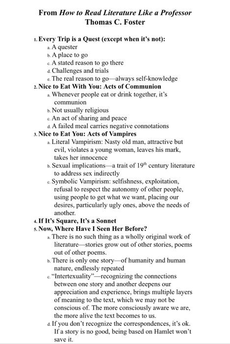 Summary Analysis Foster claims that one of the delightful things about being an English professor is being able to recognize recurring characters and archetypes within literature. In Thomas Fosters book How to Read Literature Like a Professor it is written that there are five aspects of a quest. - When reading literature many uses of intertextuality and allusion may reference Shakespeare very often.